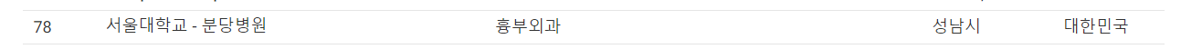 심장외과학 세계순위 78위, 국내 2위인 병원은 바로 분당서울대학교 병원 심장혈관흉부외과 입니다. 분당 서울대 병원은 건강보험심사평가원 평가에서 관상동맥우회술 분야 최고등급인 1등급을 획득하였다고 합니다. 또한 긴급 심혈관수술을 위한 핫 라인을 운영하여 응급환자들을 빠르게 수술하도록 운영하고 있는 병원입니다. 분당 서울대 병원의 사이트를 들어가면 수술의 종류에 맞는 재원일 수가 진료비 등을 확인할 수 있습니다. 참고해 주세요.