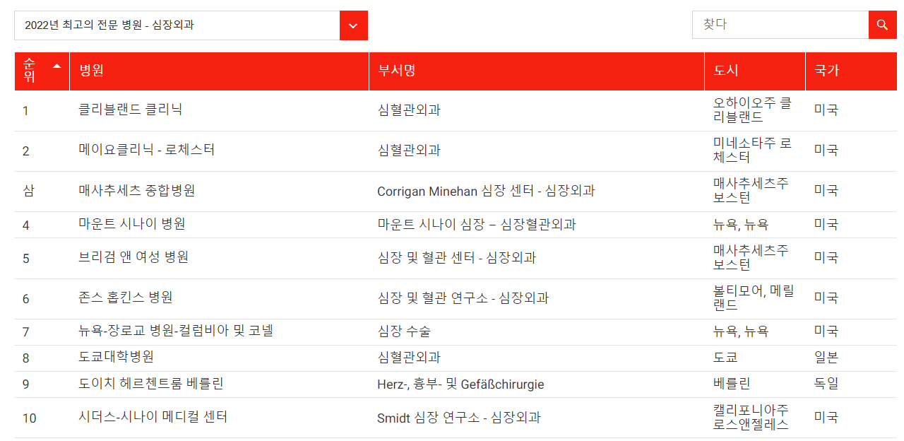 세계최고의 심장외과학 전문병원은 역시나 미국 오하이오주 클리블랜드에 위치한 클리블랜드 클리닉이 1등입니다. 2위 또한 미국으로 미국 미네소타주 로체스터에 위치한 메이요 클리닉 - 로체스터 입니다. 3위 병원은 매사추세츠주보스턴에 위치한 매사추세츠 종합병원으로 선정되었습니다. 1위에서 10위까지 알아보았습니다.