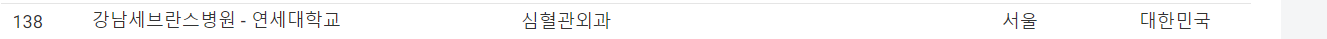 그렇다면 대한민국의 순위는 어떻게 되는지 알려드리겠습니다. 2022년 세계최고 심장외과 전문병원의 순위는 150위 까지 선정되어 있고 이중 3곳의 병원이 국내 최고의 심장병원으로 선정되었습니다.